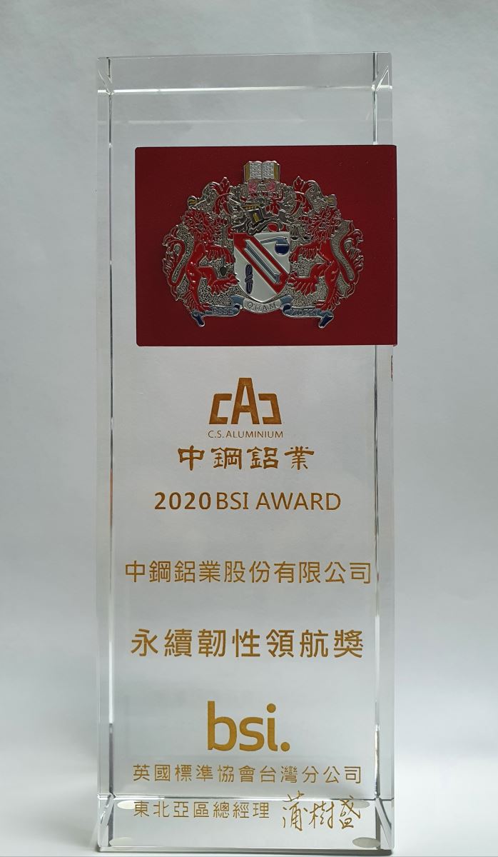 2020年11月19日,「2020 bsi國際永續標準管理年會」於台北市圓山大飯店10樓國際會議廳盛大舉行,除邀請國內專家學者暢談未來的永續行動等經驗分享外,並於會中表揚國內在CSR領域中有前瞻作為與卓越貢獻之企業。「永續韌性領航獎」係英國標準協會(bsi)用以表揚以多項國際標準累積永續實力,持續創新,培養迎戰多變未來永續韌性能力的企業楷模。另「台灣永續能源研究基金會」為鼓勵企業善盡社會責任,多年來持續辦理「台灣企業永續獎」,中鋼鋁業今年亦再次獲得「台灣企業永續報告類 傳統製造業金獎」。